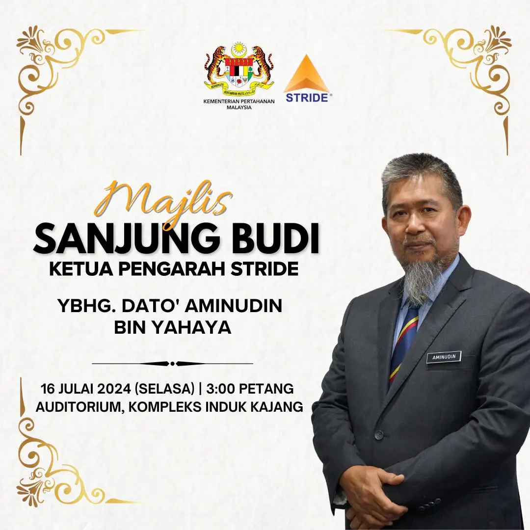Majlis Sanjung Budi Ketua Pengarah STRIDE akan diadakan seperti ketetapan berikut: Tarikh : 16 Julai 2024 (Selasa) Masa : 2.30 petang hingga 5:00 petang Tempat : Auditorium Blok A, Kompleks Induk STRIDE, Kajang, Selangor Darul Ehsan